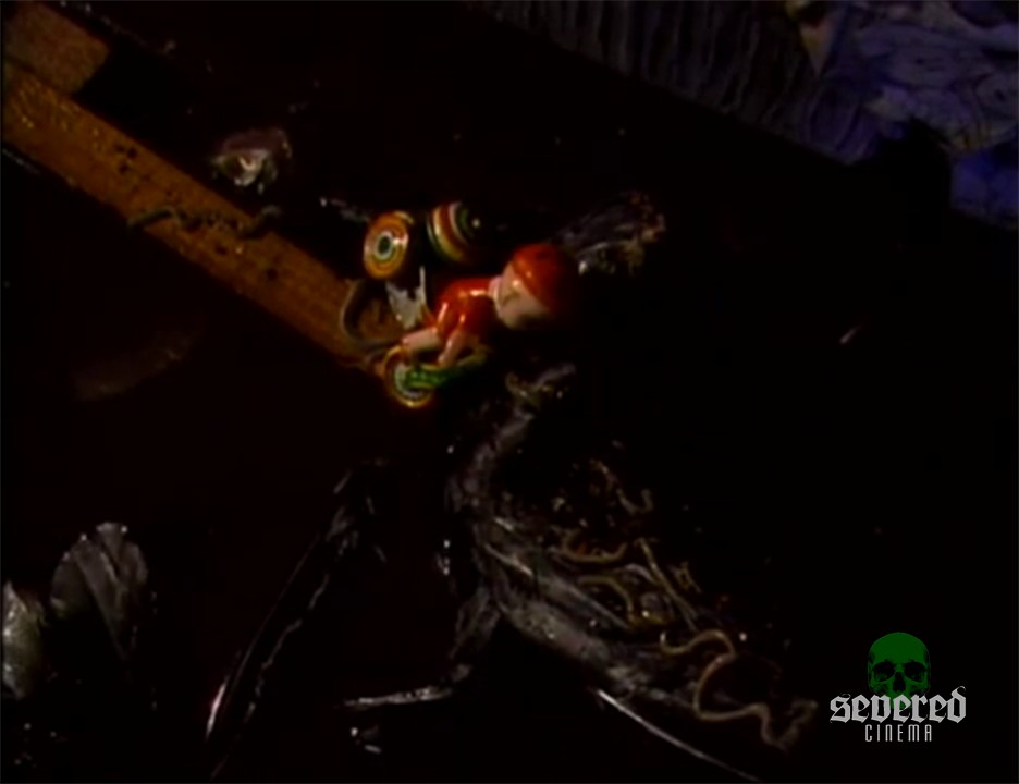 In the sewer: A Halloween dog mask. A red ball. A catcher’s mitt. Children’s toys and dead wormy fish. Many worms now eating dead flesh of a cat in the filth. An uncannily realistic dead baby with more worms over its mouth floats in a shallow watery grave.