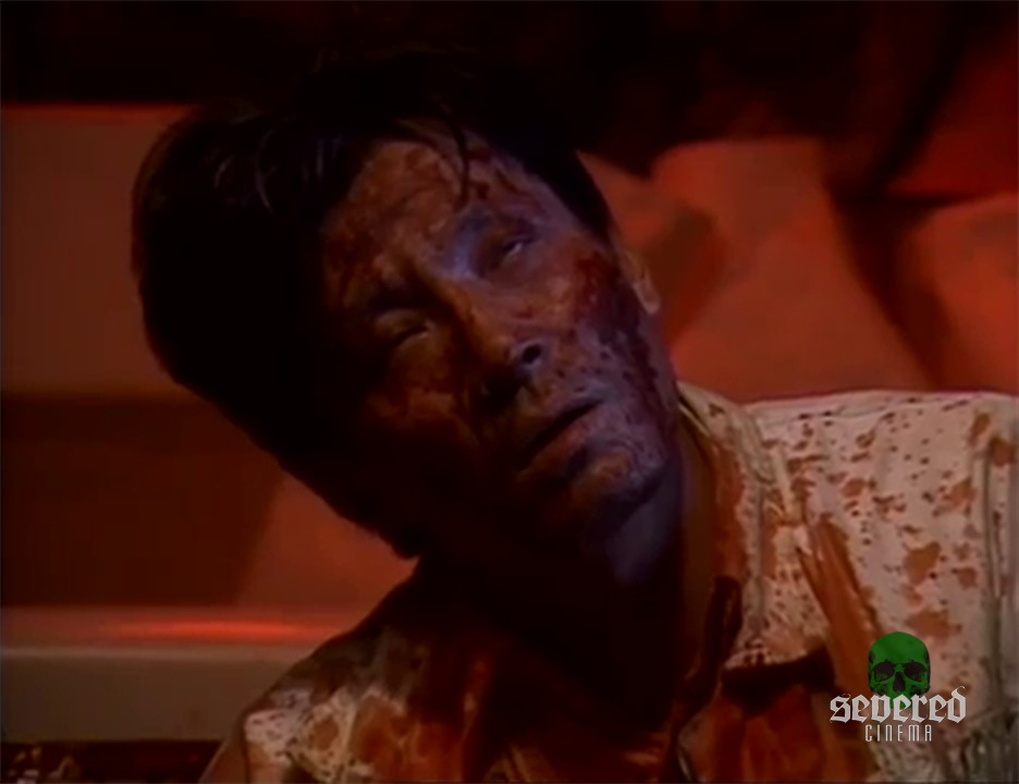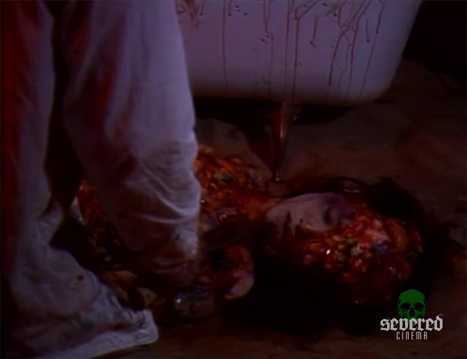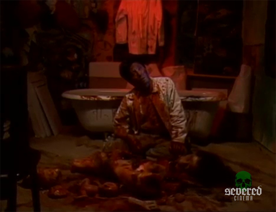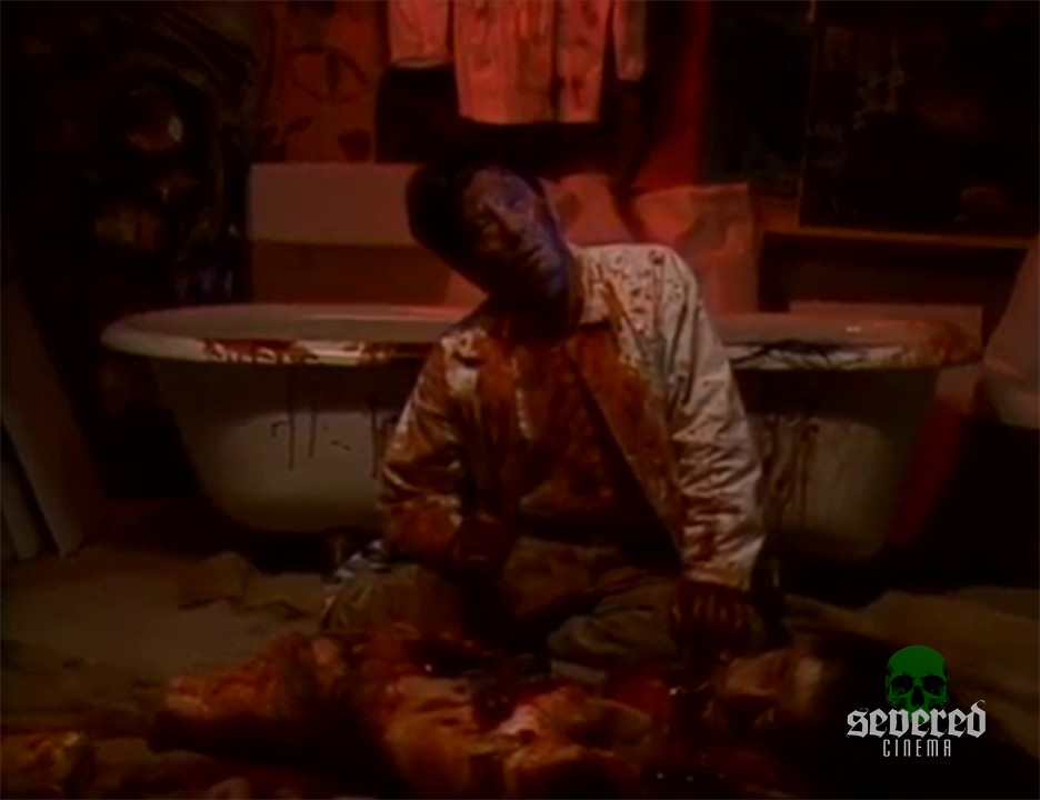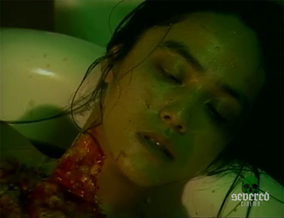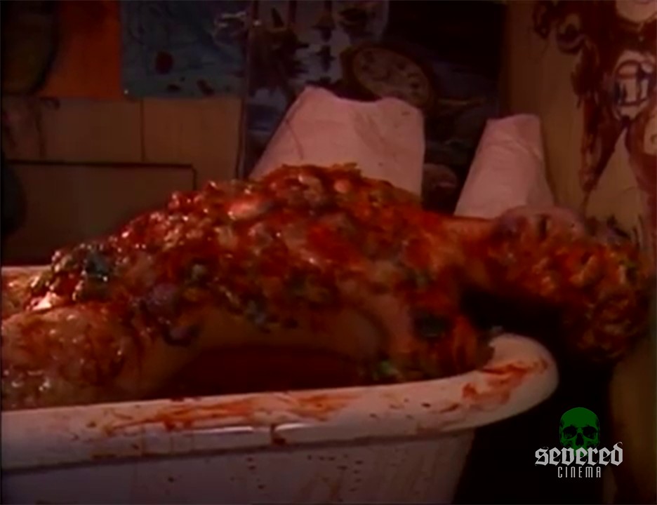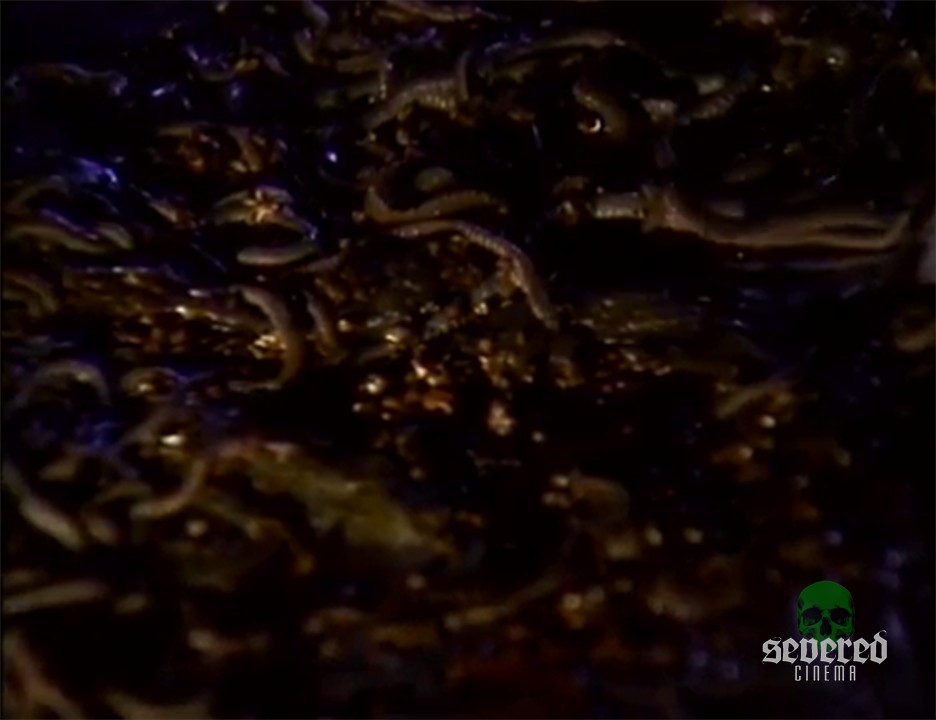 He tries to take the worms from her body. One worm is grossly drawn out slowly from an open pustule. These parasitic worms have been growing and feeding on the mermaid for God only knows how long. A very long bloody worm slithers out of the bathtub and onto the floor.