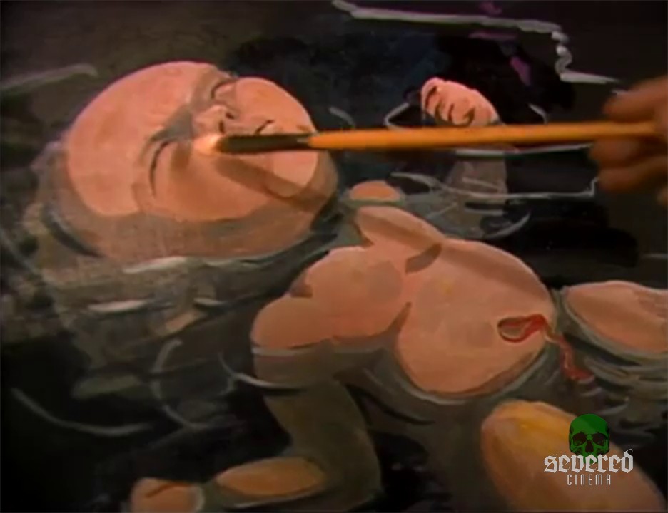 She’s dead. But he just keeps painting her corpse of course! The painting evolves to her dying face. A bloodier, fishier version of David Cronenberg’s Brundelfly. Only she vomits bloody worms instead of acidic glucose.
