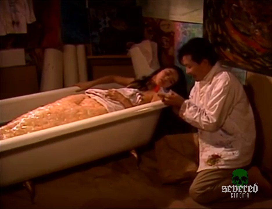 The painter continues painting callously. Fulfilling his “mission” as she dies slowly in his bathtub.