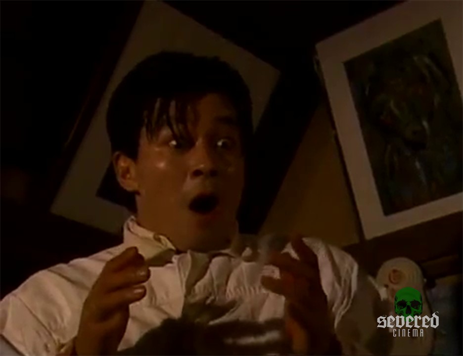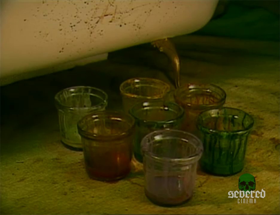 The artist finds his dead wormy cat. He names it Chibi. He holds it to his face with love and extreme grief. “You poor thing.” he cries. Then instantly drops it in the sewer water. “I am a painter. I have to paint Chibi.” He starts to paint frantically. But a splash alarms him from further down the sewer, just out of sight, in darkness. He points his flashlight to investigate the mysterious splashing.