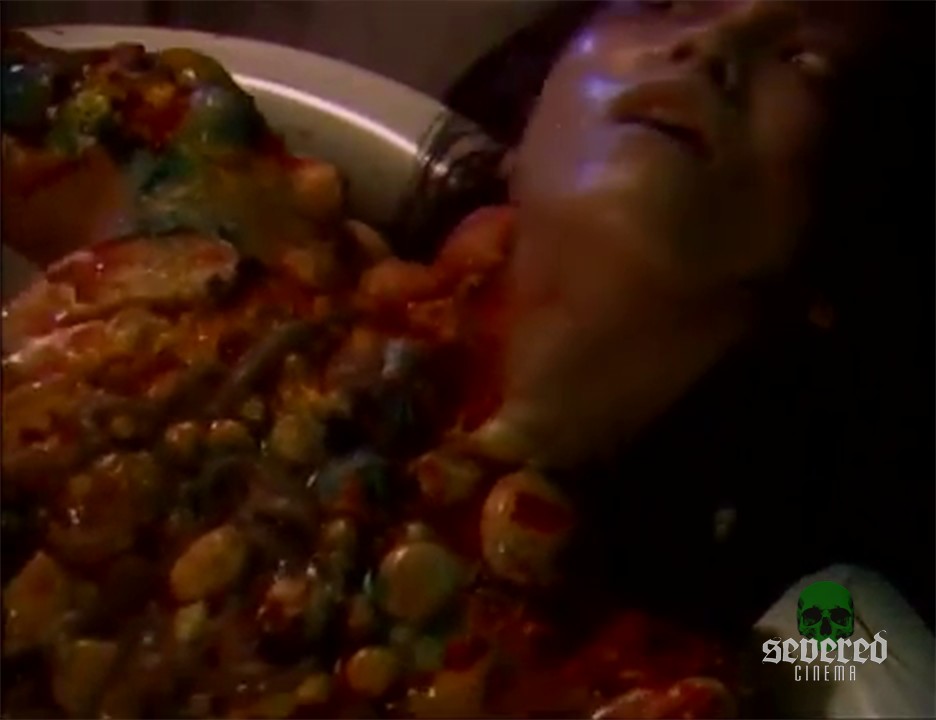 He needs to take a break. He’ll get her some more fish. But first more contortions and a burst from the pustules comes a new flurry of color and worms again all over her body. Break time’s over, I guess.