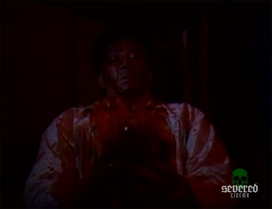 He takes a giant butcher knife with a gleam in his eye. He begins to turn her into human sushi. Her blood, his paint. Through all these heinous parasites and blood, he pulls out a baby from the Mermaid’s belly, and he stares at his dead bloody son as the pixels get grainy with intent as a graphic choice. His world getting broken in this moment. (Truth creeping into his mythology at last?)