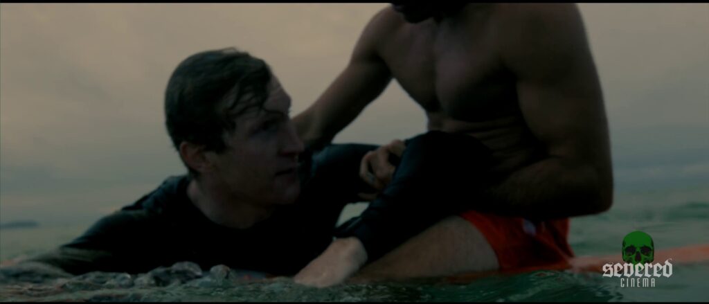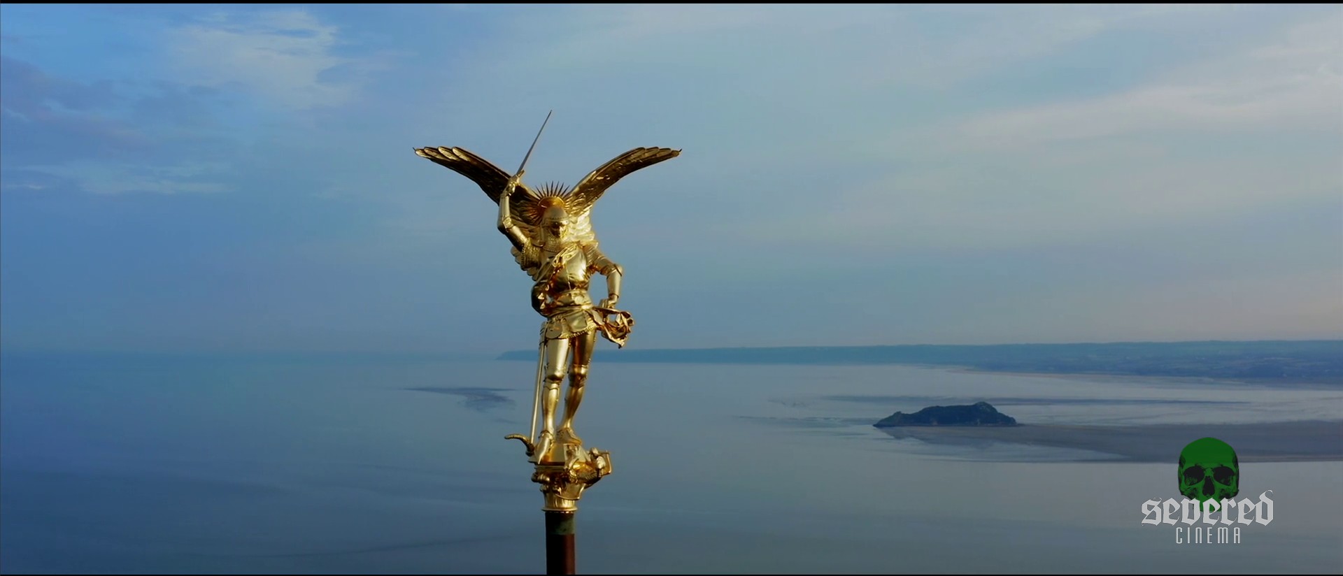 Chapter 2: Deep Dive: A drowning man is rescued by lifeguards, framed alongside surreal footage of the Saint Michael statue defeating the dragon at Mont Saint-Michel Abbey. Beautiful, symbolic, yet it all still feels spliced from separate projects.