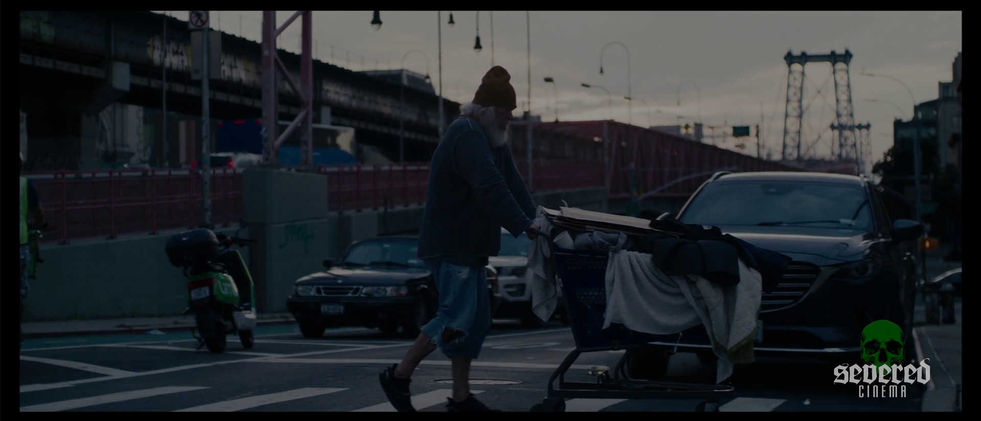 Chapter 5: Spectrum – Embrace the Light: A homeless man drags a cart through city streets. The Bible slams down in slow motion. Then there’s an abrupt shift. An awkward music sequence begins: a band plays, but vocals clash with the rhythm, genres collide, and tonal whiplash ensues. Faces rush the screen, war footage dances to pop beats, neon-drenched women gyrate, the Grim Reaper strolls by. The result is baffling.