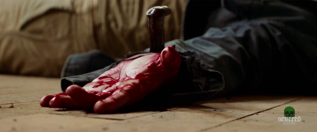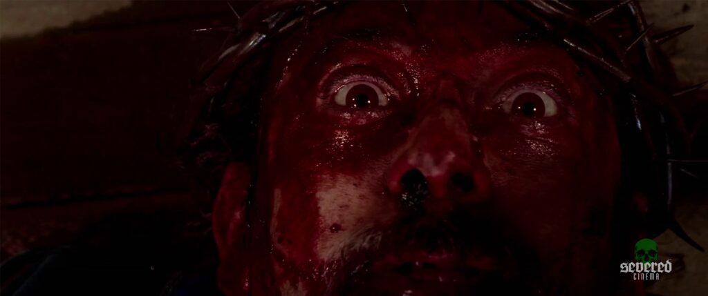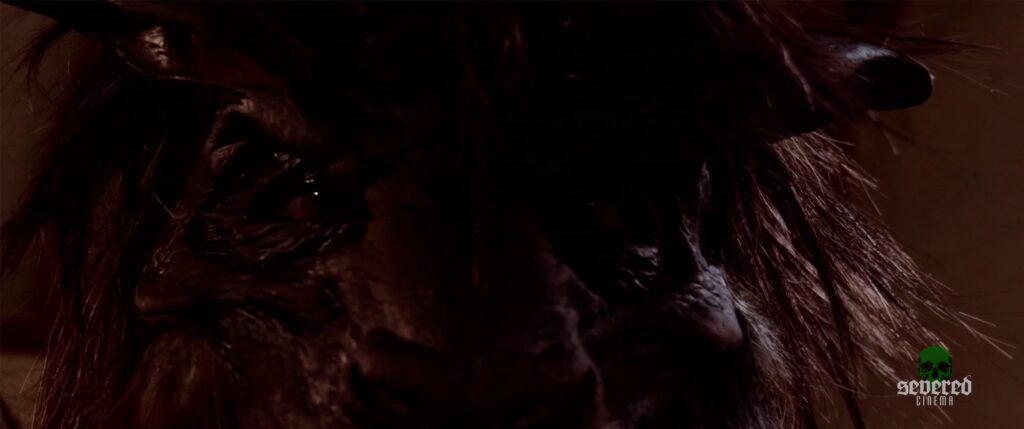 Oh dear. We see 45 and I wish he’d stayed maybe in the shadows or with just those glimpses. As Fallon lays back crucified, a big black fluffy fucking teddy beard wearing a mask and wobbly horns drones on and on. Budget is budget, but I’ve seen tight films wisely keep their big bad semi hidden and it works so well. 45 is cuddly, he could be a plush toy with (wobbly) horns.