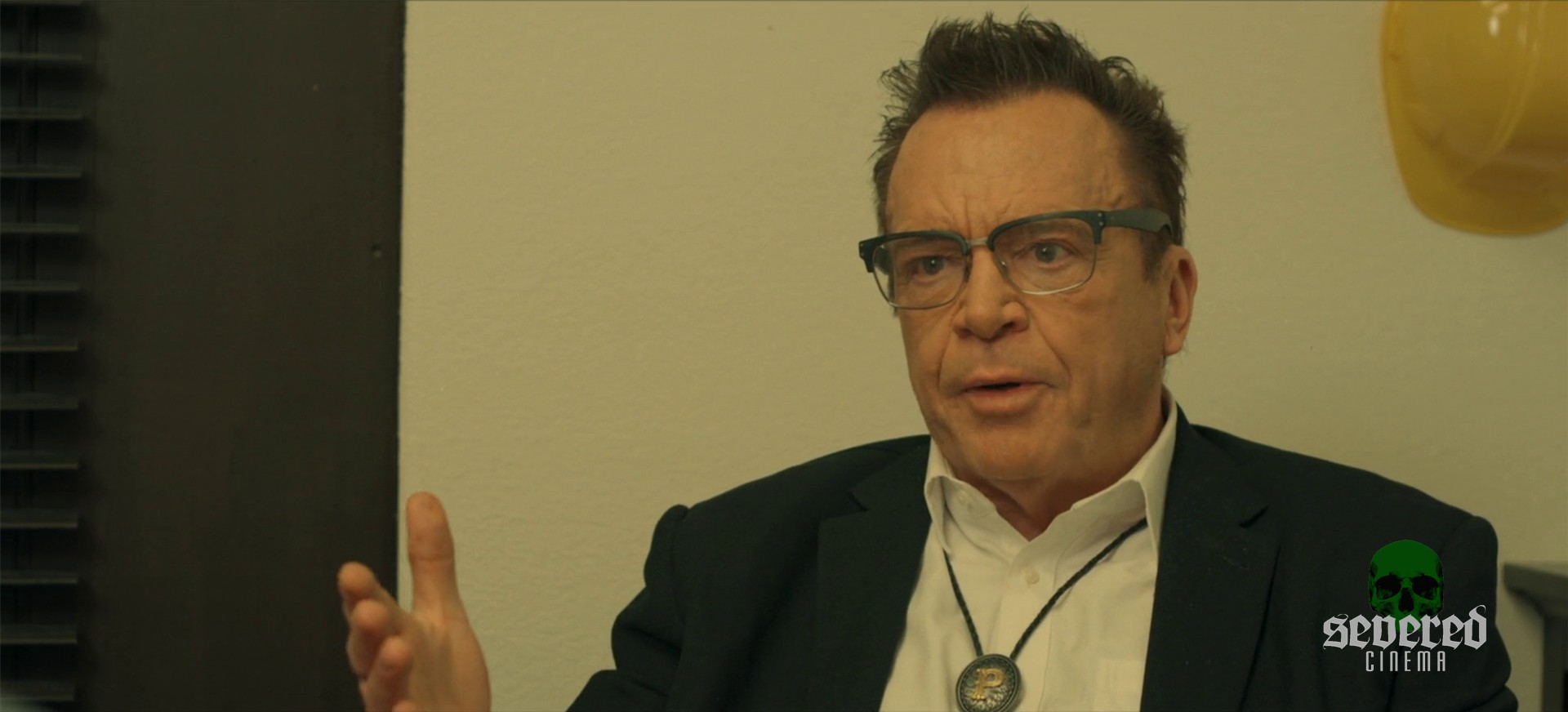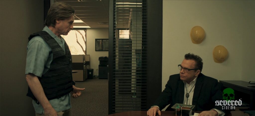 It’s now evil corporation time with the head of it being none other than, Tom Arnold! He hates being interrupted during lunch for his “special bird time” with that metronome bird that bobs back and forth, like the one in Alien (1979). It’s hard to believe they’re still around. Tom is an impatient man. Especially when it comes to his evil plans to dispose of toxic waste as evidence. The two truck drivers who died in the opening scene were his and he needs two new schlubs to finish the job.