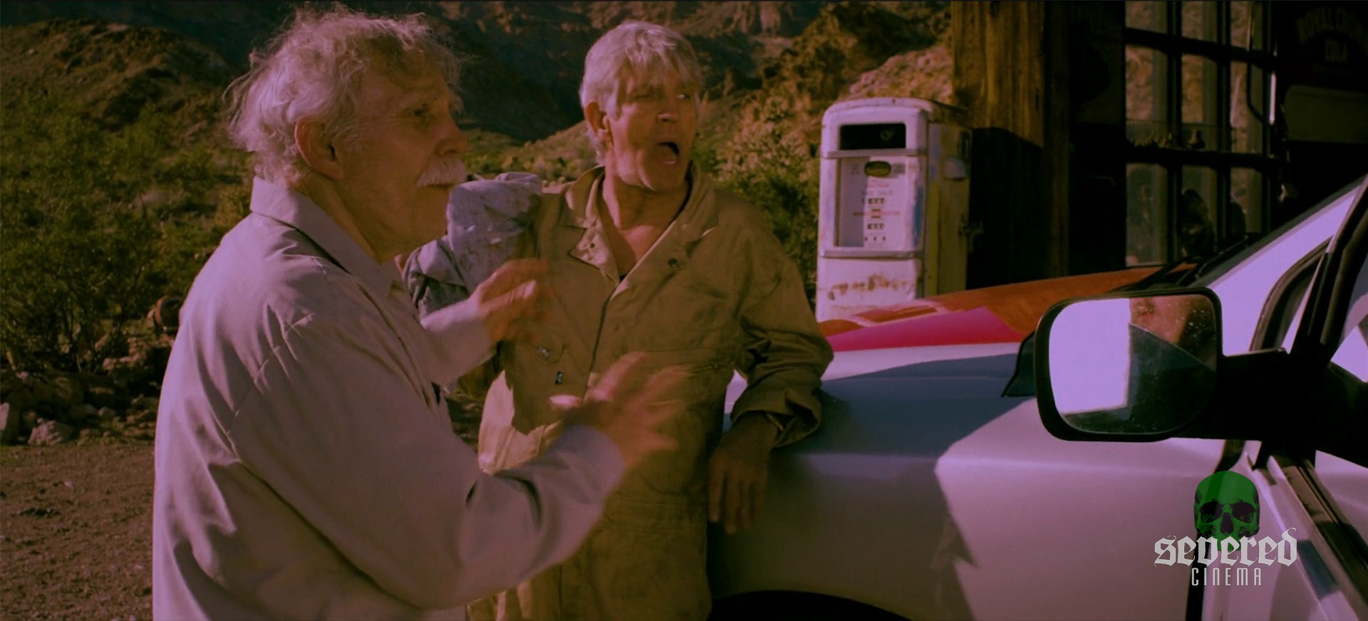 After shenanigans with his 21 mid-girlfriend, with her family making dolphin noises perversely, off the scmuck boyfriend, and friends go into the middle of the desert, squared. They run into the foreshadowing gas attendants who are hitting on the boys and the girls and kissing each other. Screeching and monkeying around with each other like chimpanzees, including Eric Roberts who ends with a freaky parrot-like repeating of “Tata!” (Instead of cawcaw). Creepers!