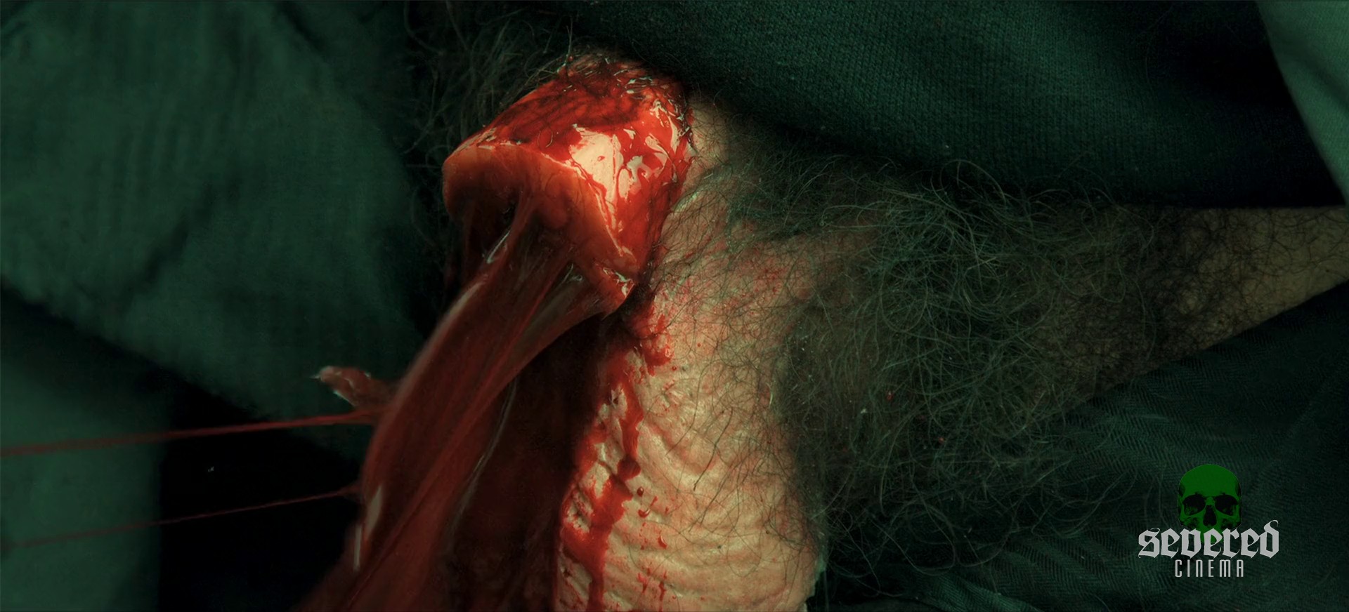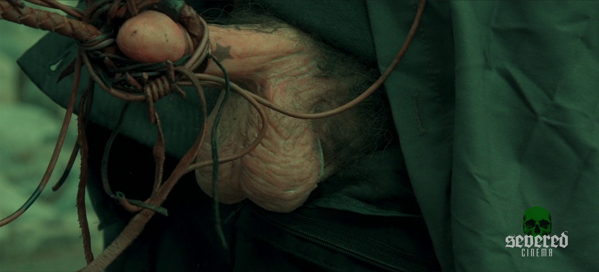 Two truck drivers who dump pollution for a living exit their truck. We get the usual banter found in grindhouse-style films about balls being better off on the inside. To prove his point to his retarded friend he kicks him in the nuts. His friend has no hostility. All in a day’s work apparently. (He ‘turned the other nut’ instead of cheek, I guess). The nut kicking truck driver takes a piss nearby and a leather barbed wire and spiked strap latches onto the tip of his full-on penis and rips it off in bloody stump fashion in gruesome oozing detail.