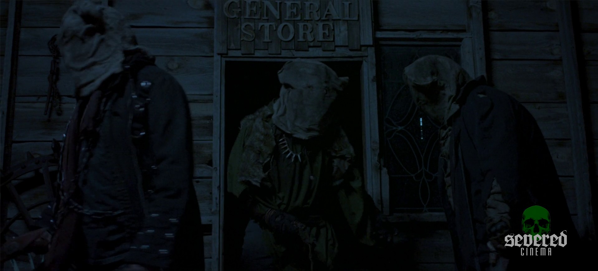 Meanwhile the retard who got his nuts kicked, in his cowboy hat, is grabbed by an unseen fiend and his head is dunked into the open barrel toxic waste melting his face into a fleshless corpse. The fiends finish him off.