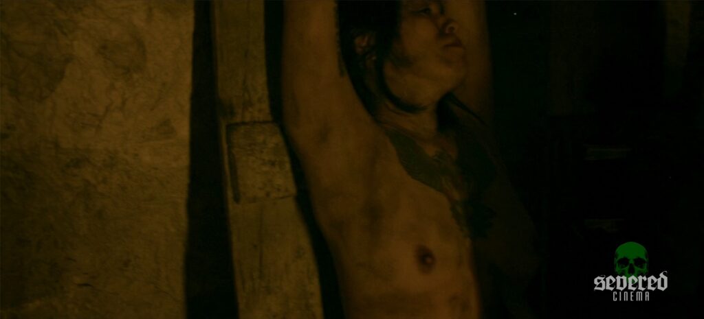 In the cave are two naked hunnies bound up and about to be mutilated before getting devoured. They are excited that they can eat everyone at this concert. But the bound-up dirt covered hotties are defiant. This pisses off one fiend who says her “tattoos make her meat taste like shit” so he cuts off huge swathes of her arm flesh to remove the tats. Fair play.